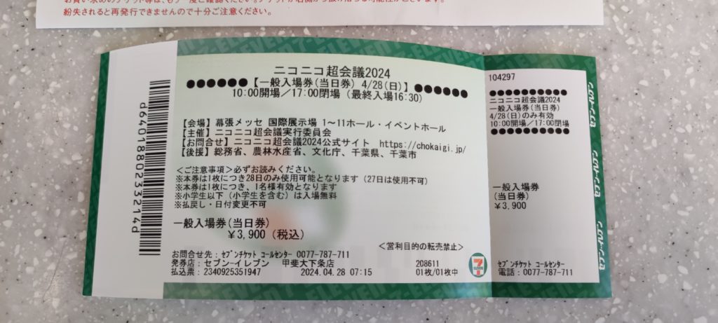 家を出て、適当なところのコンビニで一般入場券を発行してもらう。最近はセブンも発見できるんだと感心しつつ券を受け取る。